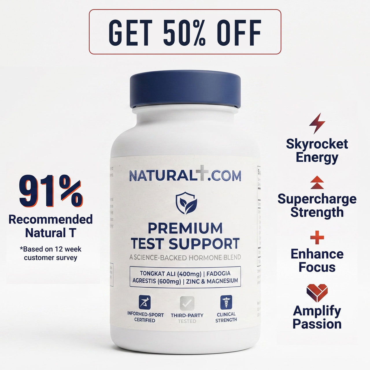 Join thousands of men who've reclaimed their energy, strength, and confidence with NATURAL T. Try it completely risk-free with our 90-day money-back guarantee.
